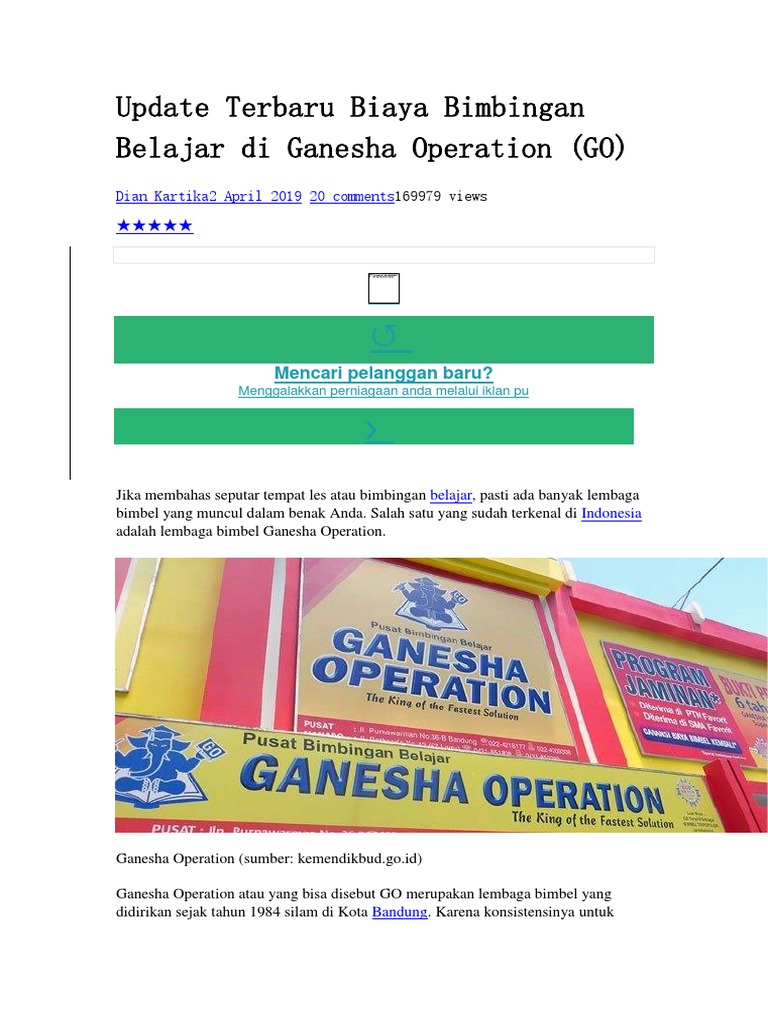 Info biaya terbaru bimbingan belajar di ganesha operation via harga.web.id brosur bimbel car interior design via carinteriordesign. Viimeisimmät twiitit käyttäjältä ganesha operation (@officialgopusat). Rencananya mau di ganesha operation (go) ambil program 3 semester (skg ane kelas xi, jadi smpe kelas xii pas snmptn). Permasalahan yang kedua menurutnya adalah biaya tempat yang terus naik. Akun resmi ganesha operation | ig: