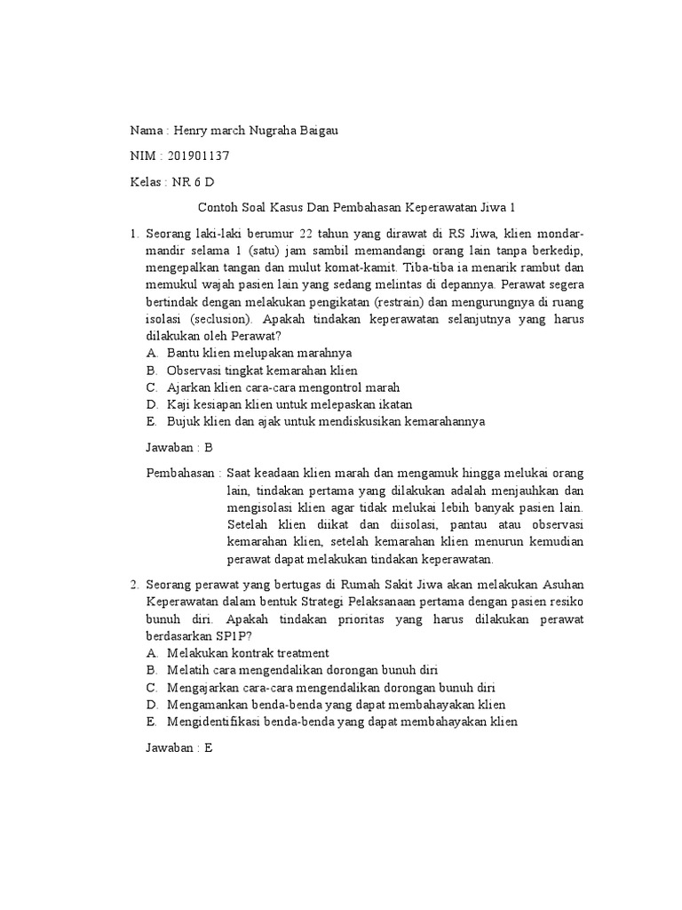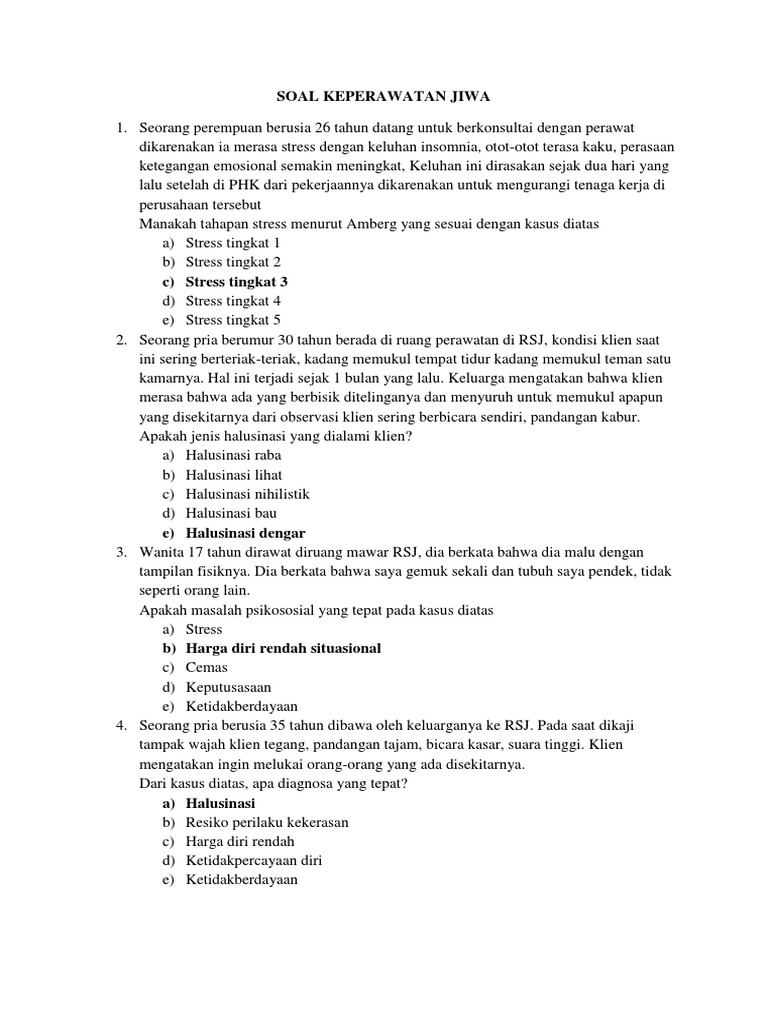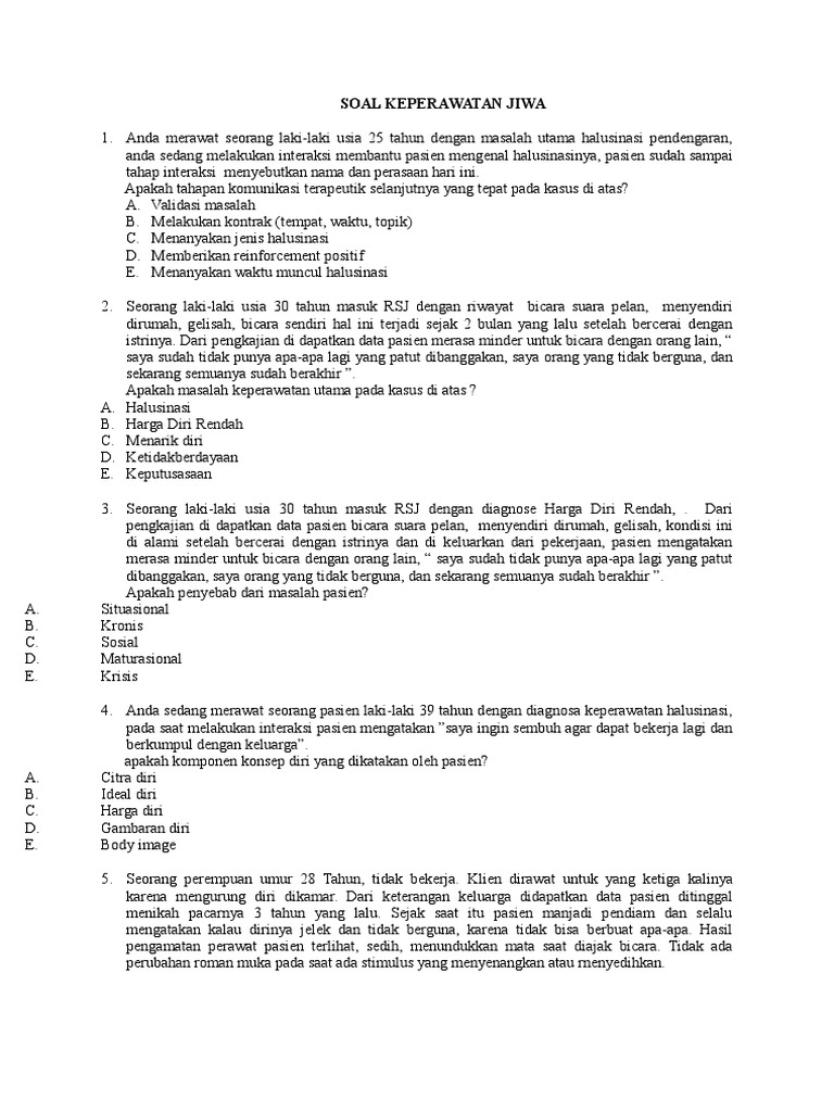 Klien mengatakan saya sangat tidak berguna, saya malu suster, rasanya lebih baik saya tidak dilahirkan saja dari keterangan keluarga hal tersebut terjadi sejak 1 tahun lalu setelah tuan k ditinggalkan istrinya menikah lagi. Soal uts bahasa indonesia kelas 3 semester 1 dan k. Berikut ini tersedia beberapa artikel yang menjelaskan secara lengkap tentang contoh soal tes kesehatan jiwa. A) otonomi dalam pekerjaan b) bertanggung jawab, dan bertanggung gugat c) pengambilan keputusan tergantung dokter d) kolaborasi dengan disiplin lain e) pemberian pembelaan (advocacy), jawaban: Perawat memutuskan untuk memasukkan klien ke ruang isolasi sambil berkata :
