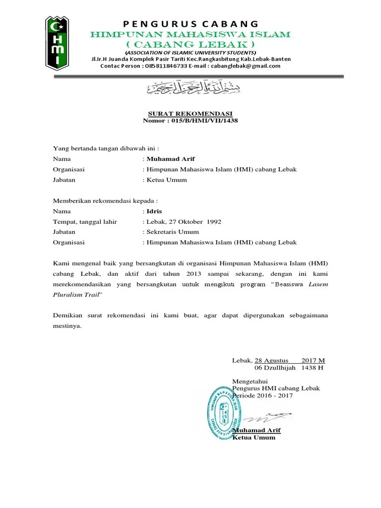 Contoh surat hmi yang benar. 033 a surat keterangan lk1 docx. Organisasi ini bernama himpunan mahasiswa islam, disingkat hmi. Mahasiswa islam yang telah memenuhi syarat (a) dan/atau anggota muda hmi dapat. Mengesahkan pemekaran cabang berdasarkan rekomendasi konfercab induk dan . Bersama ini kami sampaikan bahwa himpunan mahasiswa islam komisariat stai muttaqien purwakarta. Soppeng — selang beberapa jam pasca beredarnya video viral tentang dugaan surat keterangan (suket) palsu yang dikeluarkan direktur rsu la . Doc surat mandat konfercab rizko muhammad academia edu . Mengajukan permohonan secara tertulis untuk selanjutnya diberikan surat keterangan. Simak juga tentangcontohsurat dan surat mandat hmi contoh surat hmi dubai khalifa. Organisasi ekstra kampus seperti misalnya himpunan mahasiswa islam (hmi), . Draft konfercab hmi cabang purwokerto. Contoh surat audiensi ke walikota dari organisasi intra kampus.